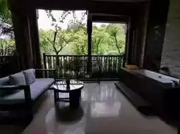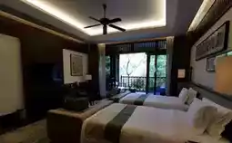 After completing the check-in procedures at the hotel lobby, the hotel's electric car took us to our room. The room is 70 square meters, and judging by the decoration and amenities, it is quite high-end. My favorite is the Thai lemongrass tea bags, the instant coffee packs have a rich flavor, and surprisingly, there are small boxes of fresh cream in the fridge for making coffee, which was a pleasant surprise. Opening the floor-to-ceiling glass door of the room, there is a balcony of more than 10 square meters with a chaise lounge and a round tea table, and there is even a large bathtub (for sweating). Looking out from the balcony, the lush green trees and verdant grass are all in sight, making one feel refreshed.