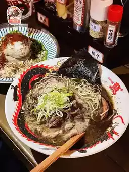 🍜 Black Dragon Ramen, the noodles are moderately soft and hard, smooth and delicious. The thick black garlic sauce, paired with pork🐷, shredded wood ear and chopped green onion, makes the soup very tasty. If you are not full, you can add noodles for free, and you can choose the soft/hard texture according to your taste😆The little brother next door ordered two more bowls! 🤭🔥Warm soup🤤, enjoy the noodles with relish!