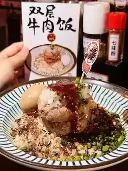 Double-layer beef rice with overflowing gravy 🐮The tender and delicious beef patties are served in double layers, and every bite is full of happiness. Pair it with chopped green onions and beef sauce, seaweed and white sesame seeds to mix the rice 🍚 well. The rich taste makes you intoxicated 😋The half-cooked runny egg with beef patties is twice as delicious! 🥚