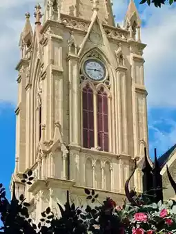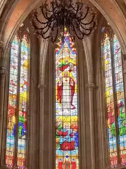 Entering Guangzhou's Sacred Heart Cathedral, the towering Gothic towers come into view, like messengers from time and space, standing quietly amid the bustling city. The stone walls are majestic and ancient. Sunlight filters through the stained glass windows, casting a vibrant hue and shadow gently across the stone pillars and pews, lending the space a sacred atmosphere.
