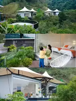 1️⃣ Stay at Zhenyi Wooden House, a half-mountain detached house surrounded by mountains and forests, full of negative ions 🍃 Large floor-to-ceiling windows, beautiful mountain views, the curtain is a big screen theater, kids love it