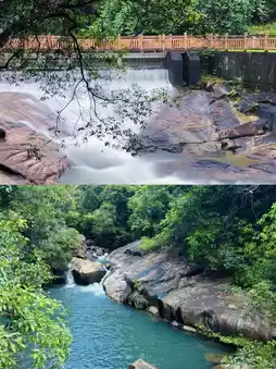 ✅The plank road winds up along the waterfall, and the clear pool is like an emerald