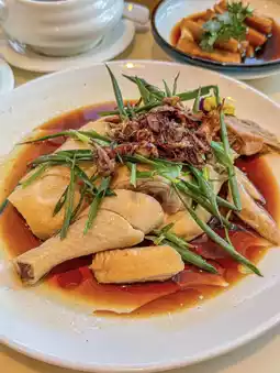The self-raised Qingyuan free-range chicken is drizzled with scallion oil, the skin is golden and crispy, the meat is plump, tender and tough, and the scallion oil and soy sauce are really delicious.