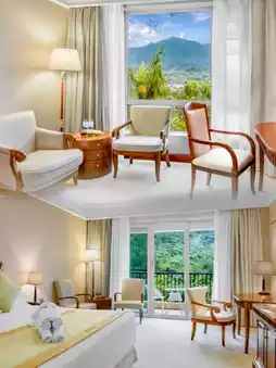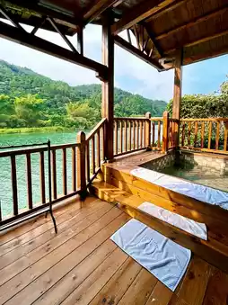 The room types are super varied, especially the round view queen room, which has a floor-to-ceiling window that offers a panoramic view of the stream and riverside scenery.