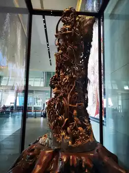 The museum houses a collection of products representing Lingnan intangible culture in Guangdong Province, including lion dance, Cantonese opera, wood carving, martial arts, Cantonese embroidery, dragon boat, and Yingge dance, all of which can be appreciated up close. In the "Bay Area Unity" exhibition area, a large ivory carving made of buffalo bone and using the technique of tooth carving, presents the representative natural and cultural landscapes of 11 cities in the Guangdong-Hong Kong-Macao Greater Bay Area, including the Canton Tower in Guangzhou, the Ruins of St. Paul's in Macau, and the Opium War Museum in Dongguan. The exquisite ivory carving is a masterpiece that is sure to impress!