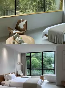 [270-degree panoramic floor-to-ceiling windows] The room has large floor-to-ceiling windows with a wide view. You can enjoy the beautiful scenery outside while lying on the bed. In the early morning, the sun shines in through the window, and you wake up to the sound of birds singing, starting a beautiful day; in the evening, watching the afterglow of the setting sun shining on the mountains and forests, the scenery is so beautiful that it makes you intoxicated. 🌅