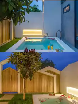 🍃 The style of the villa area is slightly different, with gray and white exterior walls and modern geometric spires. There are also floor-to-ceiling windows.