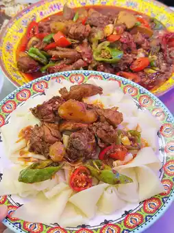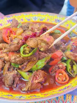 The flat noodles are chewy and absorb the sauce of the big plate chicken, spicy and satisfying🔥