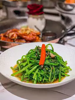 The seemingly messy water spinach is carefully separated into stems and leaves, creating a refined and beautiful dish. Refreshing and crisp, the chef's attention to detail is evident.
