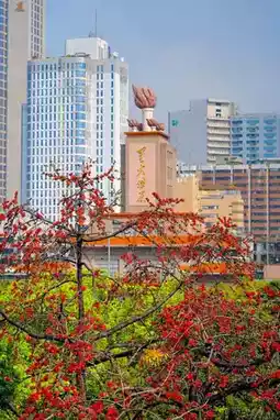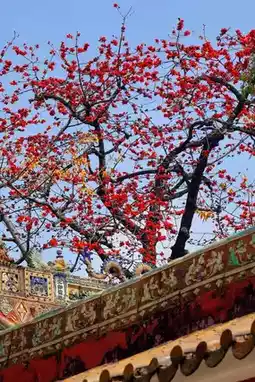 Against the backdrop of the blue sky and sunshine, the kapok flowers are as red as fire.
