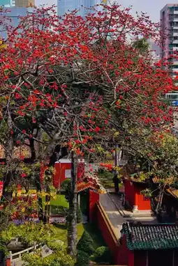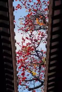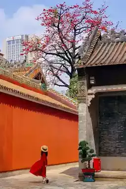 3. Guangji Hall is located on the right side of the entrance to the Peasant Movement Training Institute. Walk straight in and you'll find the spot between the eaves. With the eaves on both sides as a frame, look up and shoot to capture a kapok flower picture like a traditional Chinese painting.