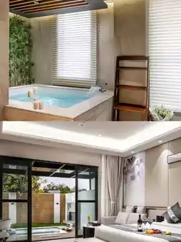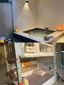 This is a two-bedroom rental, perfect for bringing kids! Babies can enjoy private hot springs, and the balcony overlooks lush greenery. The hot spring children's play area is also a highlight, where kids can have endless fun.