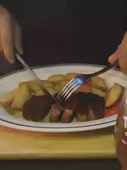 The rotating barbecue tower is grilled in the open kitchen. The beef is sizzling on the rotating grill. The chef slices the meat with a knife and wraps it in the hot burger. The meat is so tender that it is juicy.