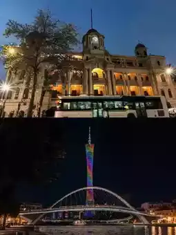 19:00 Choose the Snoopy-themed boat🚢 at Canton Tower Pier for a Pearl River night cruise to see the "Slim Waist" Tower's reflection! Capture the sunset for free at Haixin Bridge🌇. The high glass windows of the library framing Canton Tower create a dreamy shot.