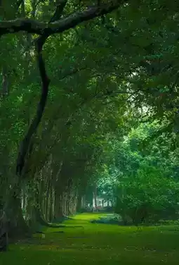 Walk slowly into the path between the rows of trees.