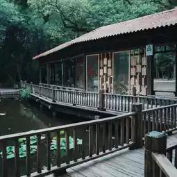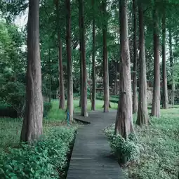 Near the park entrance (arched fence gate on the left), there are many bald cypress trees planted on both sides of the wooden plank road, giving it a magical forest feel.