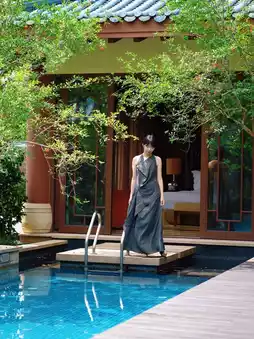 🏡 The villas completely fulfill the Chinese imagination of a luxury vacation estate, starting at two to three hundred square meters. Past the reception room lies a azure swimming pool framed by lush greenery 🏊🏻♀️ Each comes with a private sauna and hot spring bath.