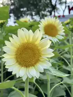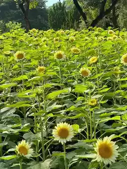 Sunflowers typically bloom in autumn, though the timing may vary slightly each year. The garden features sunflowers in colors like white and golden yellow. The white ones are as soft and creamy as butter—so unique! The golden yellow ones are vibrant and dazzling, and when the wind blows, their heads gently sway as if greeting you.
