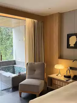 Thoughtful details that instantly win your heart 💖: The bathroom counter is stocked with makeup remover wipes and facial cleanser, which is super considerate for makeup lovers. The fruit platter comes with a peeler—perfect for detail-oriented guests! The mini bar offers complimentary first-round drinks, and there's warm dessert soup served in the evening—absolutely delightful! By the bathtub, you'll find scented candles 🕯️, creating a perfect ambiance and turning bath time into a ceremonial experience.