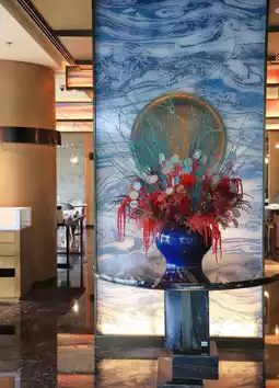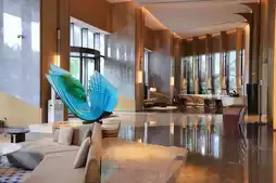Stepping into the lobby of Guangzhou Nansha Jinmao Marriott Hotel, the suspended sailboat art installation instantly draws the eye toward the 5-meter-high ceiling. The flowing curves on the blue glass curtain wall resemble rolling waves, while sunlight reflecting off the Jiaomen River pours in through the floor-to-ceiling windows.