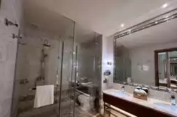 Stepping into the lobby, you're greeted by beige marble floors, cascading crystal chandeliers, and symmetrical spiral marble staircases winding upwards – the entire space simply glitters.