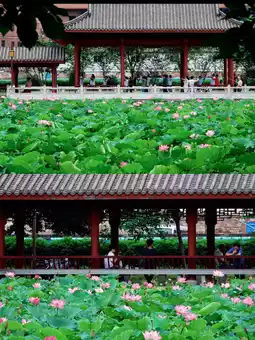 The entire park is covered with layers of lotus leaves, showcasing pink and white lotus flowers standing gracefully. A vast "sea of lotus" unfolds before your eyes!