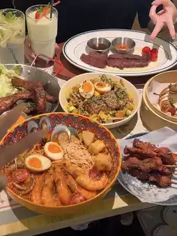 The hot spring area features one large public pool and five themed smaller pools, though some smaller pools run too hot for optimal comfort. The service counter offers three specialty teas and mandarin oranges—adequate but with room for more variety. Breakfast meets star-rated hotel standards in taste, though could benefit from more distinctive or innovative offerings.