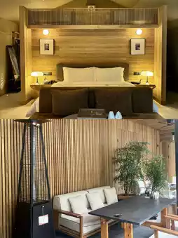 • Rooms: Entirely micro-cement floors with solid wood furniture, minibar hidden inside a rattan cabinet, welcome fruit served in rustic pottery bowls... even the switches are vintage brass!