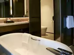 The Superior King Room with Lake View offers a generous 52 square meters of space. The room is clean and well-equipped with amenities such as a TV, refrigerator, sofa, work desk, and a bathroom with a bathtub. The bathroom is designed with separate wet and dry zones and is free of cigarette odors, complemented by an air purifier. The large bed comfortably accommodates up to four people, and the balcony provides a relaxing spot to enjoy garden views.