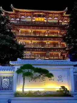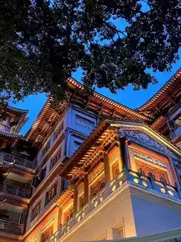 Located in the commercial heart of Guangzhou's central axis, the Pujue Tower, a large Buddhist temple, is known as the Guangzhou equivalent of Chongqing's Hongyadong Cave and the real-life version of Spirited Away. The temple, covering over 15,000 square meters, is one of Guangzhou's five largest Buddhist monasteries. Construction began during the Southern Han Dynasty (917-971), spanning over a thousand years. Construction began in 2010 on the temple's main Dharma-propagation building, the Pujue Tower, which was completed six years later. The roof is composed of specially crafted golden copper tiles, oxidized to withstand wind and rain. Even though the temple remains open year-round, it retains its grandeur and radiates golden splendor in the sunlight.