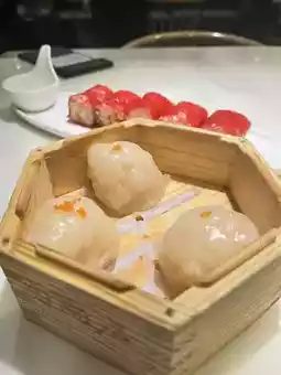 🥢 Classic shrimp dumplings and signature red rice noodle rolls have thin skins and generous fillings, but the fillings contain large chunks of pork fat 🤢