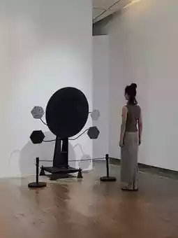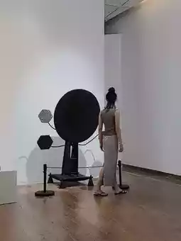 This exhibition features works arranged linearly along a long, dark-gray corridor, as if walking through a forest of sonic sculptures, surrounded by immersive electronic sounds.
