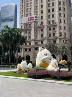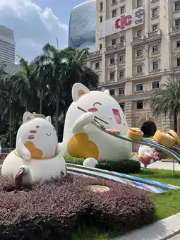 In the middle of Guangzhou’s bustling Huachenghui Central Plaza, you’ll find an unexpected and adorable landmark — a group of giant cat sculptures lounging right in the urban square.