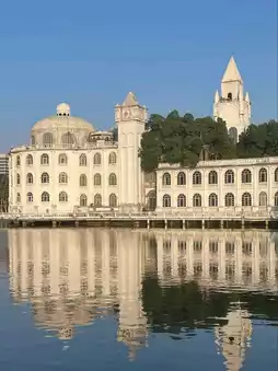 Known as the "White Palace" of Guangzhou for its European-style castle ruins (abandoned hotel) mirrored in the lake, this park blends whimsy and tranquility with: