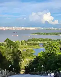 ✅ At 7 AM, I climbed to the top of the hill’s pagoda, where the morning mist swirled over the Pearl River Estuary, and in the distance, the Humen Bridge lay like a giant dragon resting on the waves🌅🌉