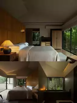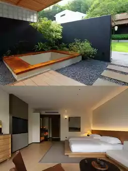 • Every room has floor-to-ceiling windows. The "Bamboo Shadow" room faces the valley directly. On rainy days, watch raindrops hit bamboo leaves; on sunny days, see sunlight filtering through bamboo gaps. It never gets boring to look at;