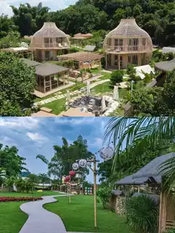 The resort is located in Huangpu District, Guangzhou, built along the mountains, backed by forest, and facing endless rice fields. Staying here, you can drive an off-road vehicle on bamboo forest paths, kayak on the lake, and choose from four types of rooms: Bamboo Forest Mountain Courtyard, Wandering Wilderness · Starry Sky Courtyard, 360° Terrace Panoramic Forest View, and Persimmon Red Wind Blowing Rice Field Courtyard. There is free parking available.