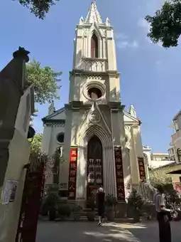 Wandering through Shamian Island felt like stepping into another era of Guangzhou — tree-lined boulevards, pastel colonial buildings, and that calm river breeze. We stopped by Starbucks inside one of the restored heritage houses, sipping coffee under the shade of old banyan trees. Afterwards, we wandered into the Our Lady of Lourdes Church, its pale spires framed by sunlight and green leaves — simple, graceful, and full of character.
