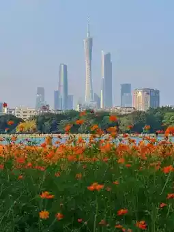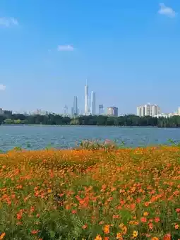 To welcome the National Games 🏃🏻♀️➡️🏃🏻♀️➡️ Haizhu Lake planted a large sea of sulfur cosmos flowers 🌼 Golden yellow and orange-red intertwined, spreading from the feet all the way to the opposite shore of the lake where the “Guangzhou Trio” stands. On sunny days ☀️☀️ the Canton Tower, East Tower, and West Tower reflect on the lake surface, as if the city is having a dialogue across the air~