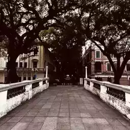 The transition is immediate. I walked across the small bridge from the city and felt the world slow down. The air was quieter, the pace was gentler. The first thing I noticed was the canopy of ancient banyan trees, their aerial roots draping down like curtains, shading grand, colonial-era buildings in pastel hues.