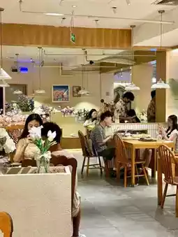 The place has a cozy wooden interior with lovely floral touches 🌸