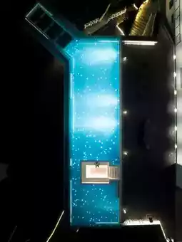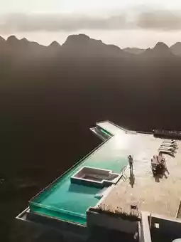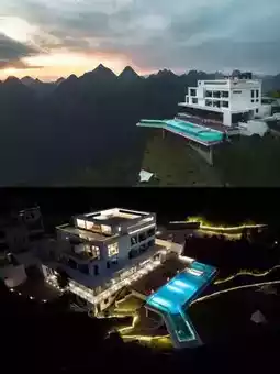 The most photogenic spot is the irregular transparent infinity pool, which even thoughtfully includes a shallow area for children to play. Opposite the pool are the continuous karst mountains and the Dripping Waterfall. The first floor public area has a restaurant, reading area, and water bar, and the entire first floor is surrounded by huge glass curtain walls, offering an unobstructed view of the scenery outside.