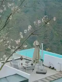 The infinity pool perched on the cliff edge resembles a stairway to the mountains—even on cloudy days or at dusk, swaying on the swing here feels dreamy.