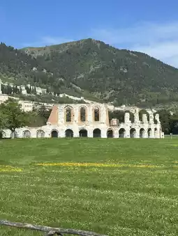 This time, we visited the charming town of Gubbio in Italy 🧳. Here, they have an ancient Roman Theater Archaeological Park 🌲, which is an open-air museum. The entrance fee is three euros, but unfortunately, it is currently closed ❌.