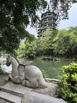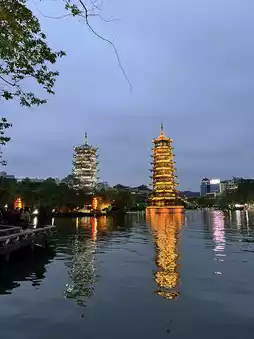 The Sun and Moon Pagodas stand prominently in the middle of Shanhu Lake. These twin pagodas are approximately 40 meters tall. The Sun Pagoda is made of brass and is the largest brass pagoda in the world, while the Moon Pagoda is made of silver-colored cement. Together, they create a beautiful and unique sight. Visitors can enjoy a leisurely stroll around the area, as the surroundings of the pagodas are a public park with a refreshing breeze from the lake. This spot is considered one of the most beautiful viewpoints in Guilin.
