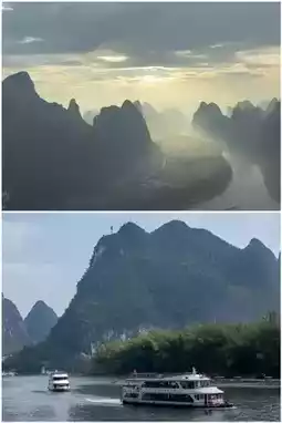 Guilin Lijiang River: A national 5A tourist attraction and the most typical karst landscape. The river is crystal clear, and the mountains on both sides are uniquely beautiful and steep. It is known for its "clear mountains, beautiful water, wondrous caves, and unique stones." The Lijiang River is described as "a hundred-mile-long gallery of paintings." Take a cruise or bamboo raft down the river to enjoy the natural beauty of Nine Horse Fresco Hill, the reflection of Yellow Cloth Shoal, and the scenery depicted on the 20 CNY banknote.