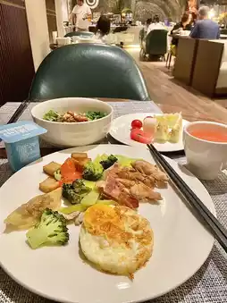 The hotel's details are incredibly thoughtful! Separate wet/dry bathroom + a spacious bathtub 🛁, premium scented toiletries, and cloud-soft bedding ☁️. Guests also receive a fruit platter and a paper travel guide. Breakfast features local specialties like Guilin rice noodles 🍜 and oil tea, with such variety it’s hard to choose!