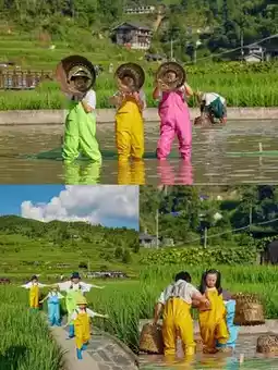Known as the "Green Gem on the Earth’s Belt," it’s a perfect place for kids to play in the water! In the afternoon, enjoy a fish-catching activity in the rice fields (Chaoyang Town, Libo County). The kids wear bamboo hats and roll up their pants to happily splash around in the fields 🐟