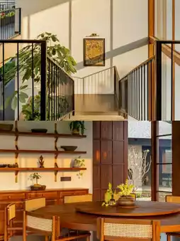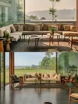 Minimal basic materials are mixed with furniture and artwork to keep the house casual. The materials used in the house are a mix of rustic natural finishes such as rough stone walls, natural teak wood, finished textured lime walls and Indian stone on the floors. Finding joy in designing spaces for people is more than just creating beautiful designs. It requires honesty, hard work, and consideration of how the designed space interacts with its environment.