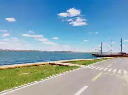We cycled along the lake, with the breeze on our faces, which was very pleasant. Next to a small grove, we stopped again to take photos on the grass, with trees and grass on one side and lake water and mountains on the other, creating a picturesque scene that was intoxicating.